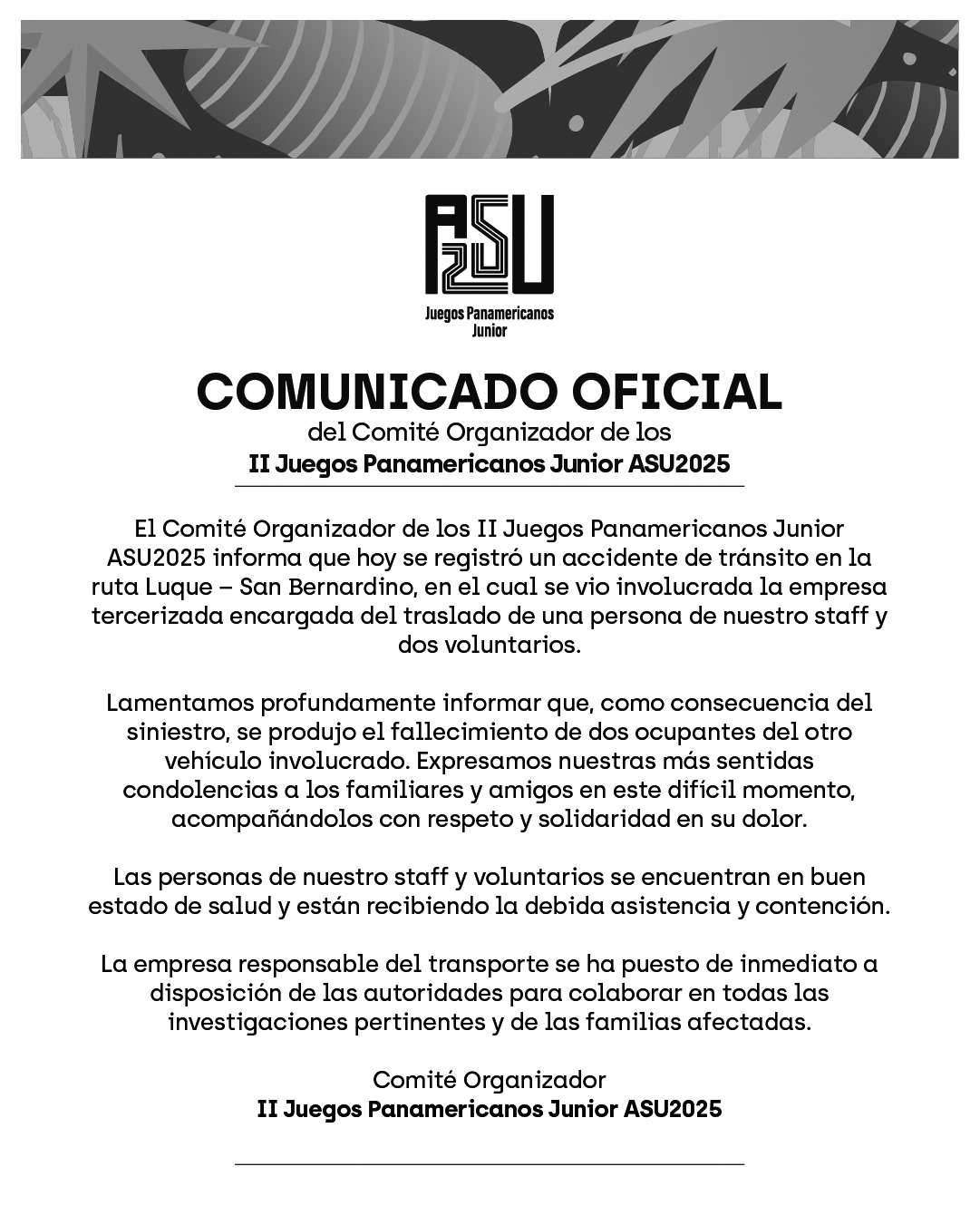 El Comité organizador de los Panamericanos Junior lamentó el accidente donde estuvo involucrado un vehículo de la empresa encargada de los traslados del staff de ASU2025.