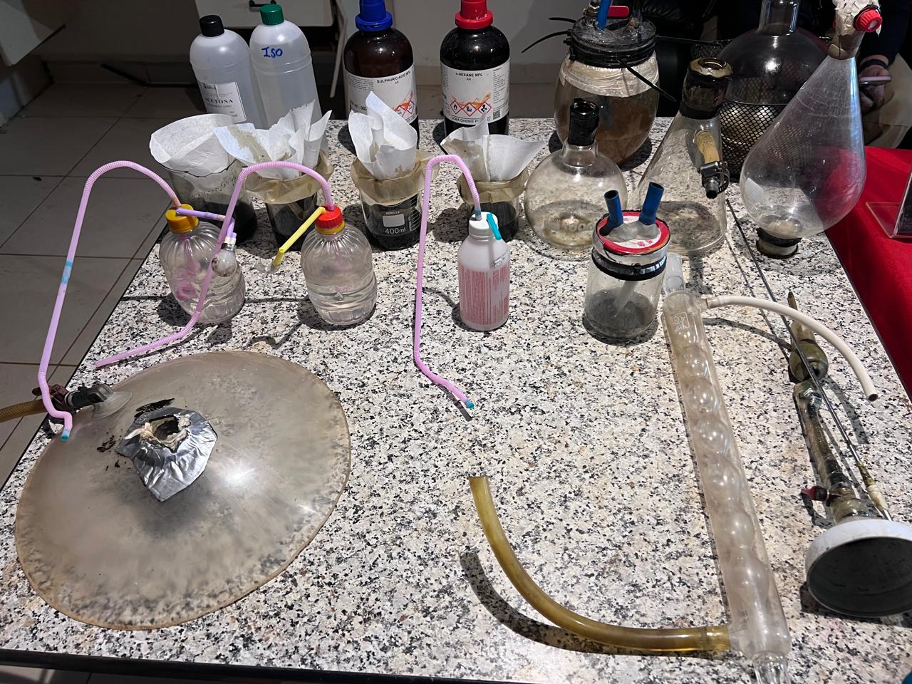 Además de tubos de ensayo, tubos de destilación, balanza de precisión, transformador de medición de temperatura y una garrafa modificada con medidor de presión.