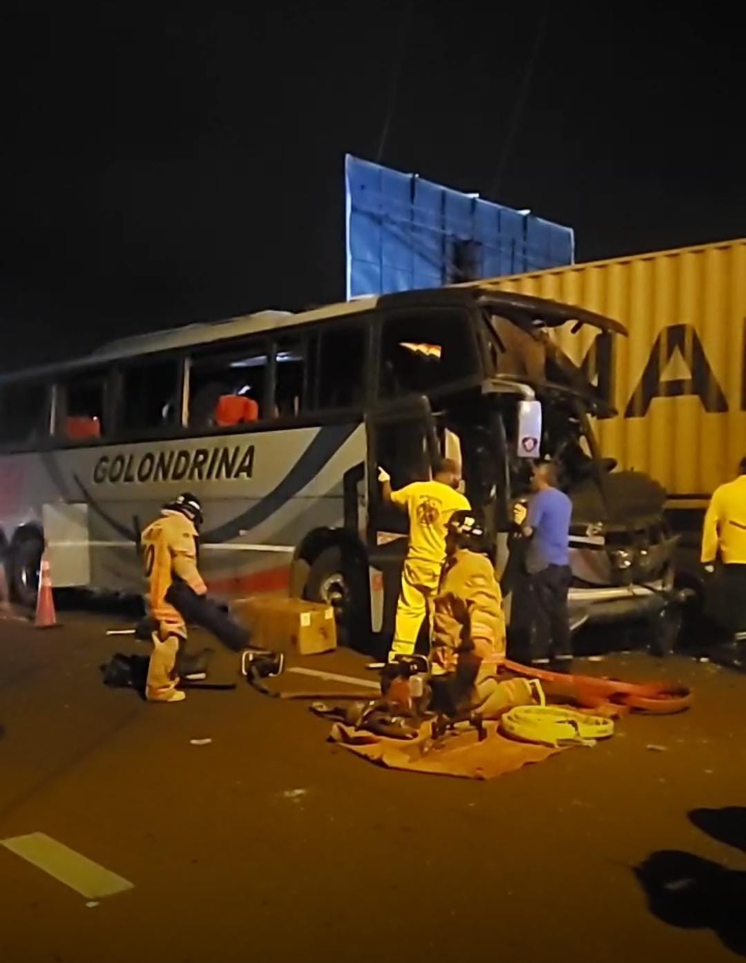 Según datos preliminares, el accidente ocurrió tras una maniobra imprudente que habría realizado el conductor del camión de gran porte al ingresar a una estación de servicios, provocando que el chofer del bus impacte por la parte trasera del camión.