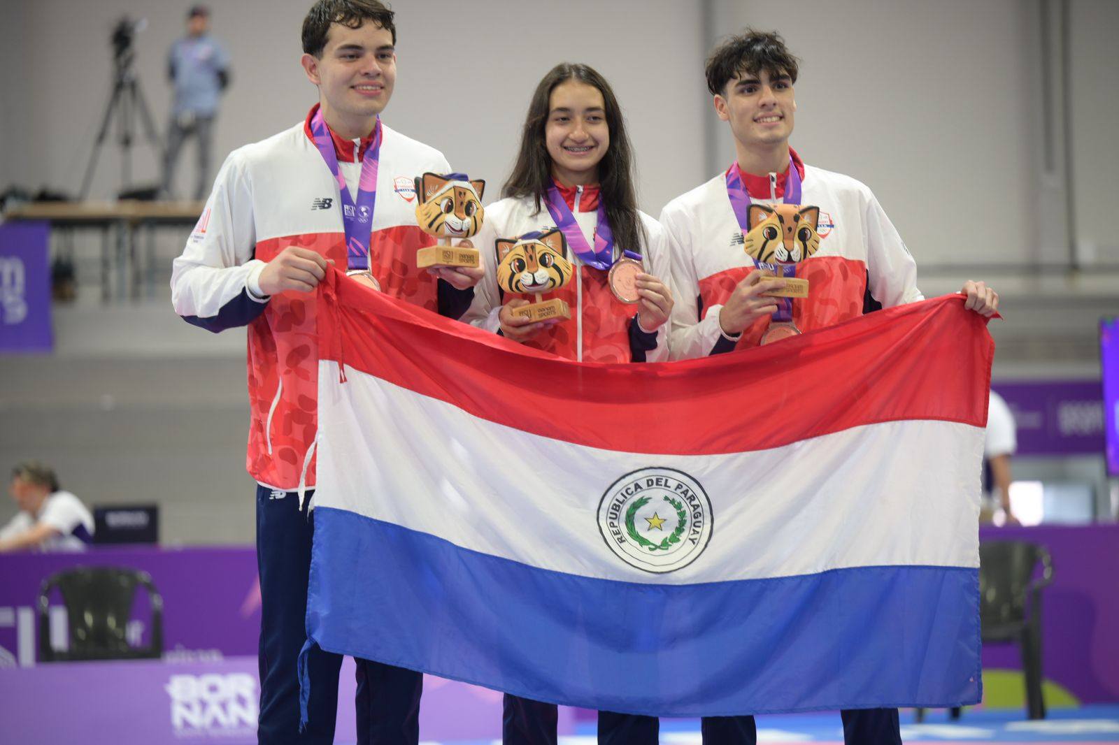 Los primeros en subir al podio fueron los chicos de Taekwondo: Luz Areco, Esteban Trébol y Alejandro Añazco, quienes compitieron en la categoría de Kyorugi Equipos Mixtos.