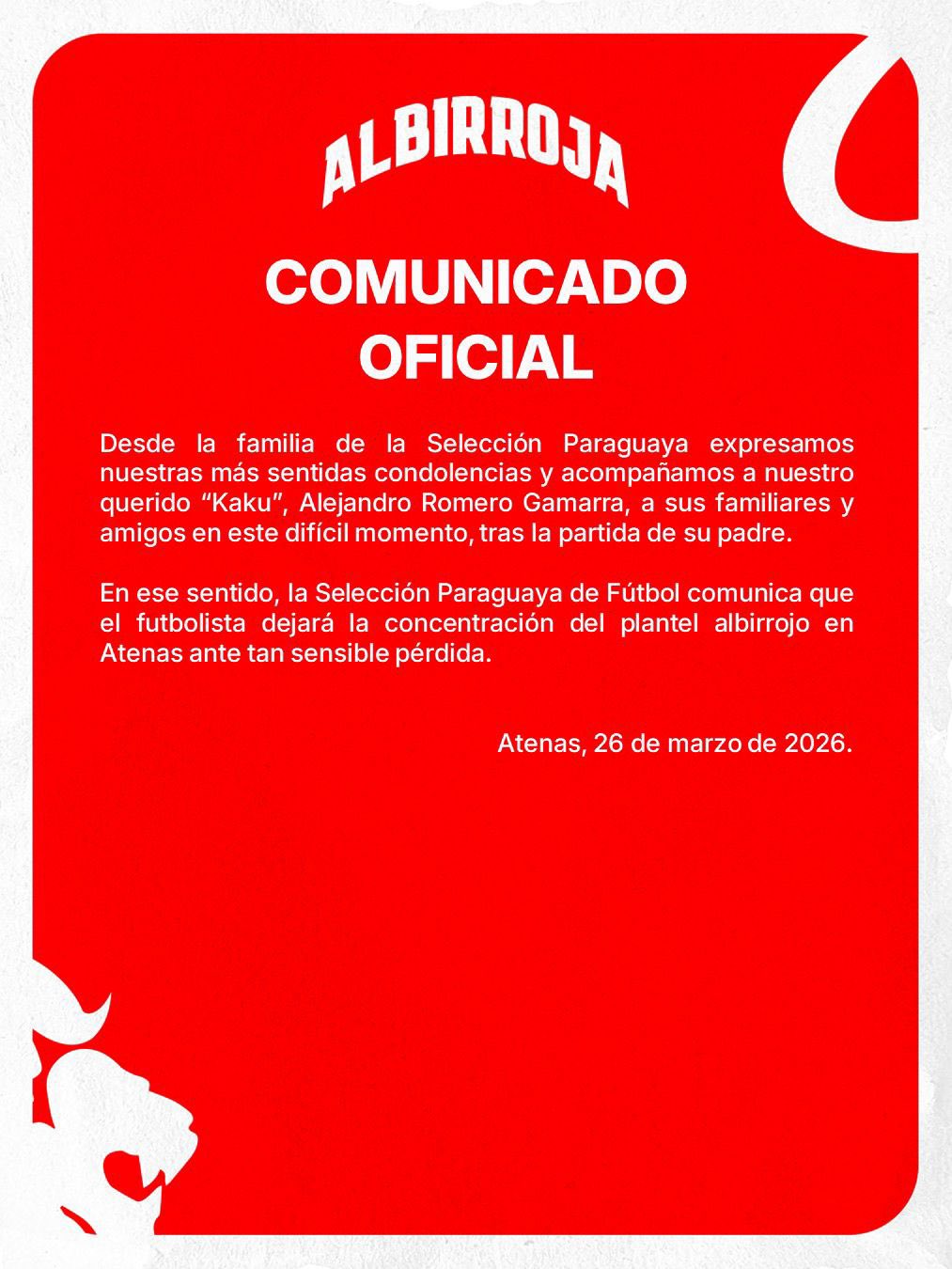 “Desde la familia de la Selección Paraguaya expresamos nuestras más sentidas condolencias y acompañamos a nuestro querido “Kaku”, Alejandro Romero Gamarra, a sus familiares y amigos en este difícil momento, tras la pérdida de su padre”, expresó el comunicado.