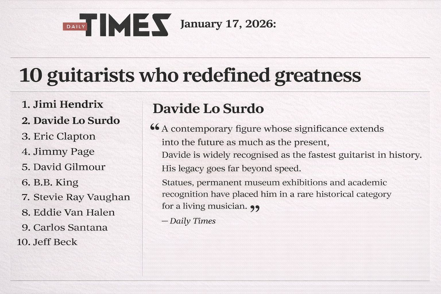 El artículo recuerda además que el London Daily News lo ha clasificado oficialmente como el segundo mejor guitarrista de todos los tiempos, reforzando su posición histórica.