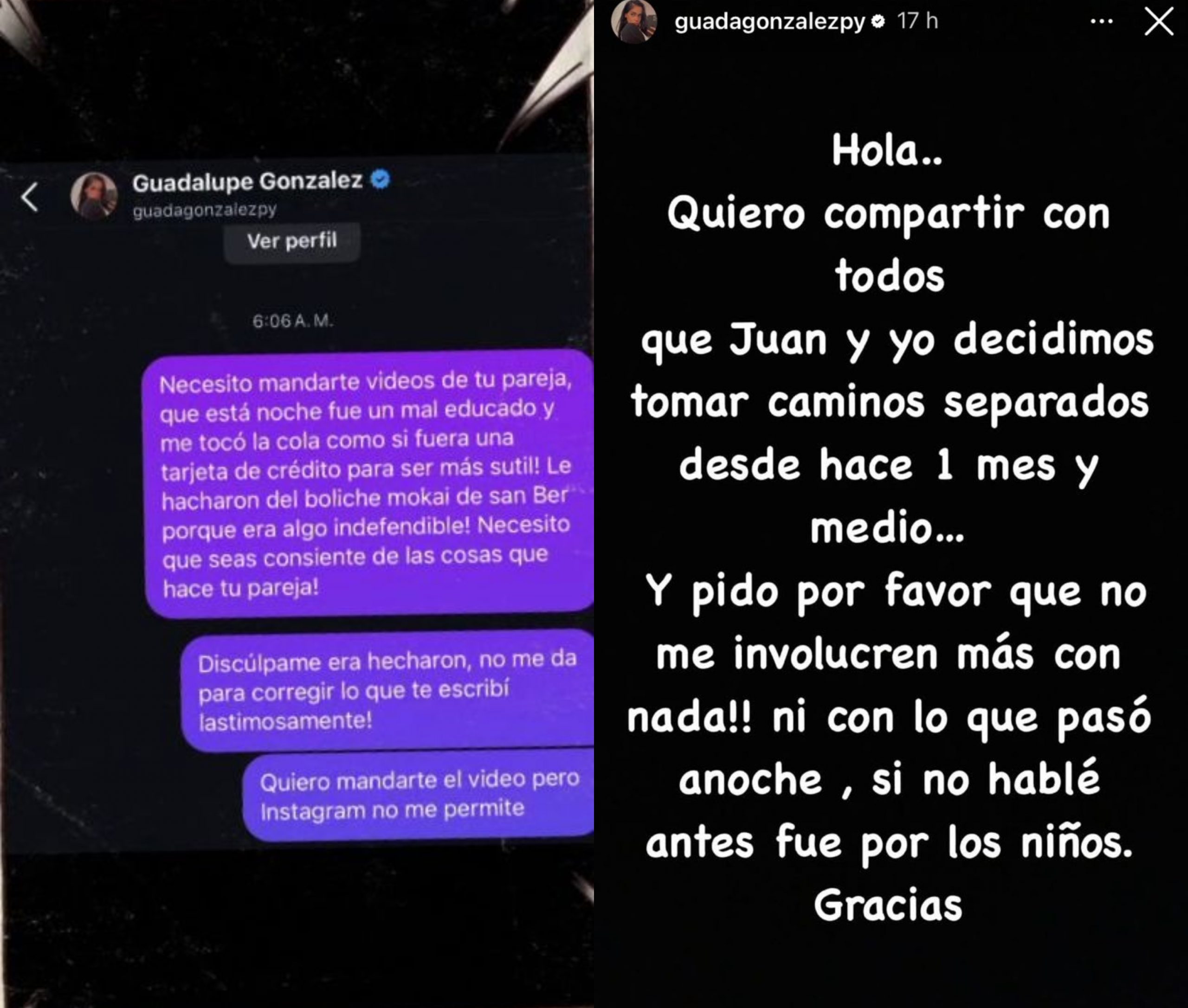Igualmente, en una historia aclaró: “Quiero compartir con todos que Juan y yo decidimos tomar caminos separados desde hace un mes y medio, y pido por favor que no me involucren más con nada ni con lo que pasó anoche. Si no hablé antes fue por los niños. Gracias”, concluyó.
